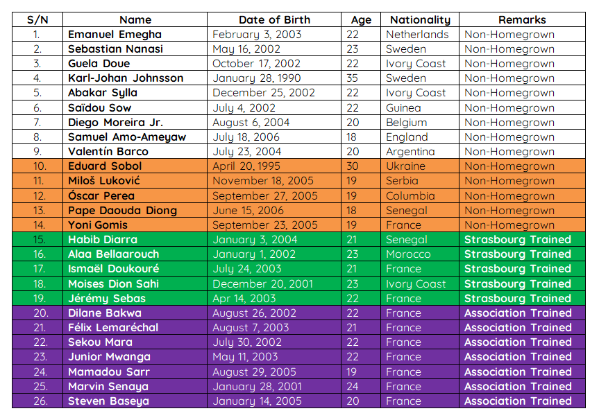 Fond vert : Joueurs formés au club (Strasbourg)