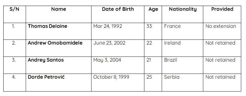 Fond orange : Joueurs non formés localement, jugés insuffisants pour le niveau des compétitions européennes. Un prêt pourrait être envisagé.